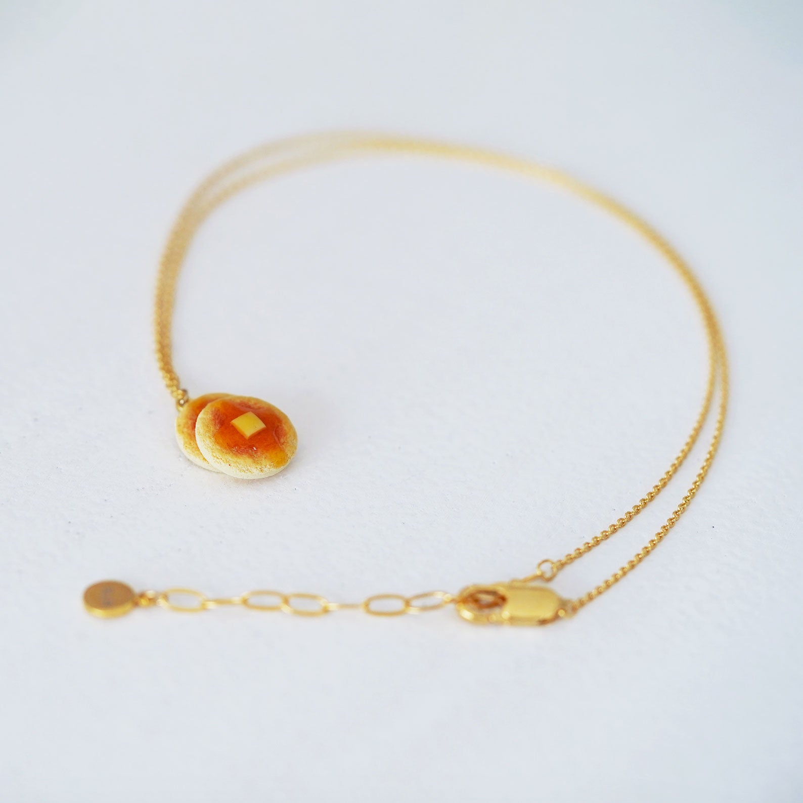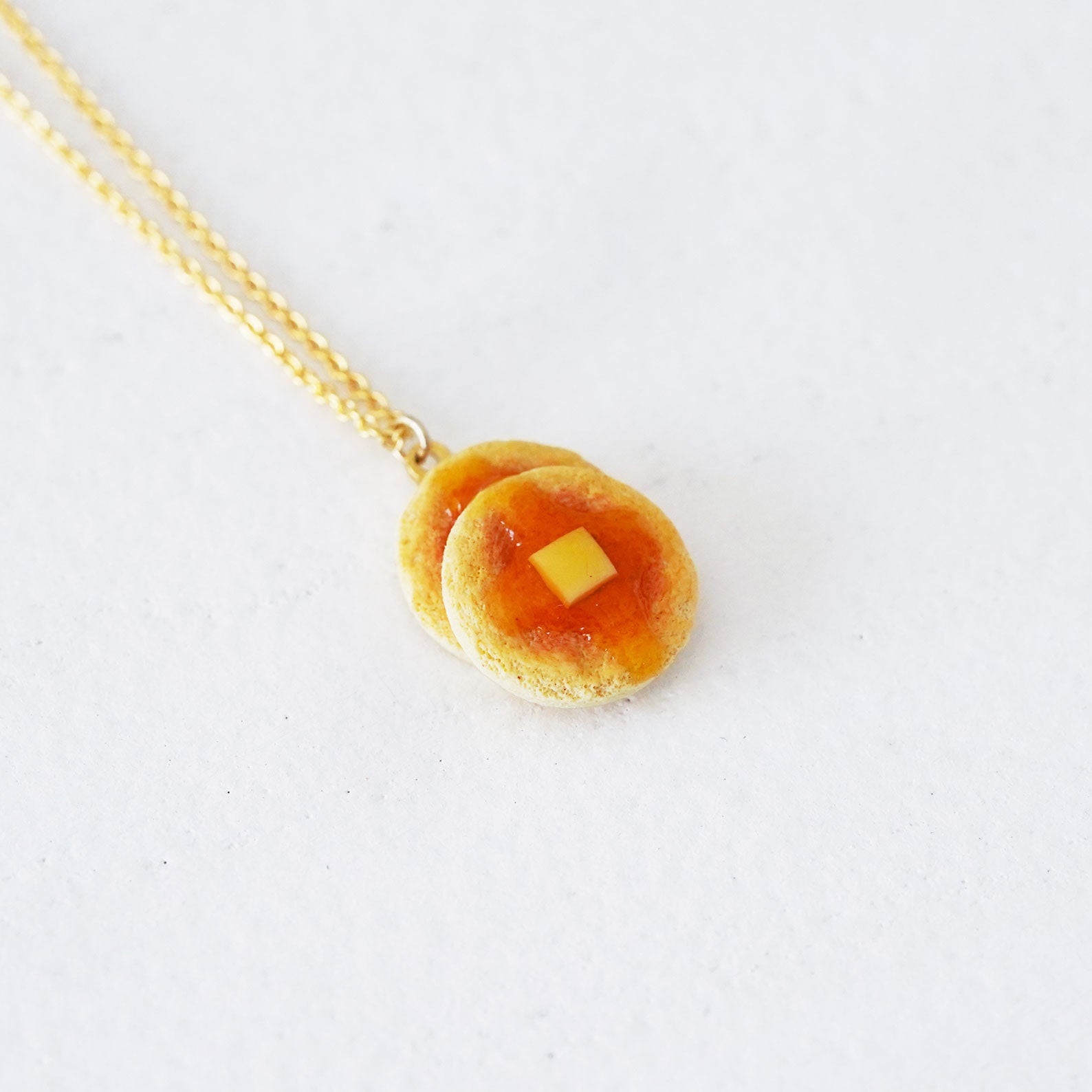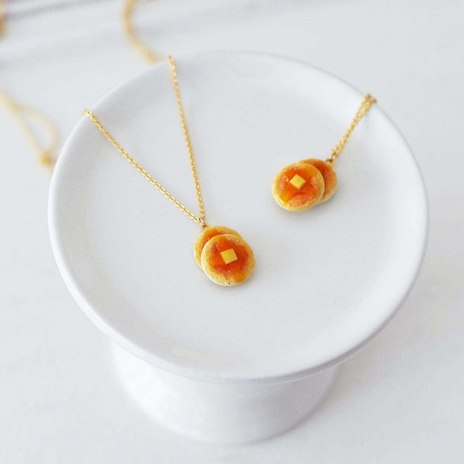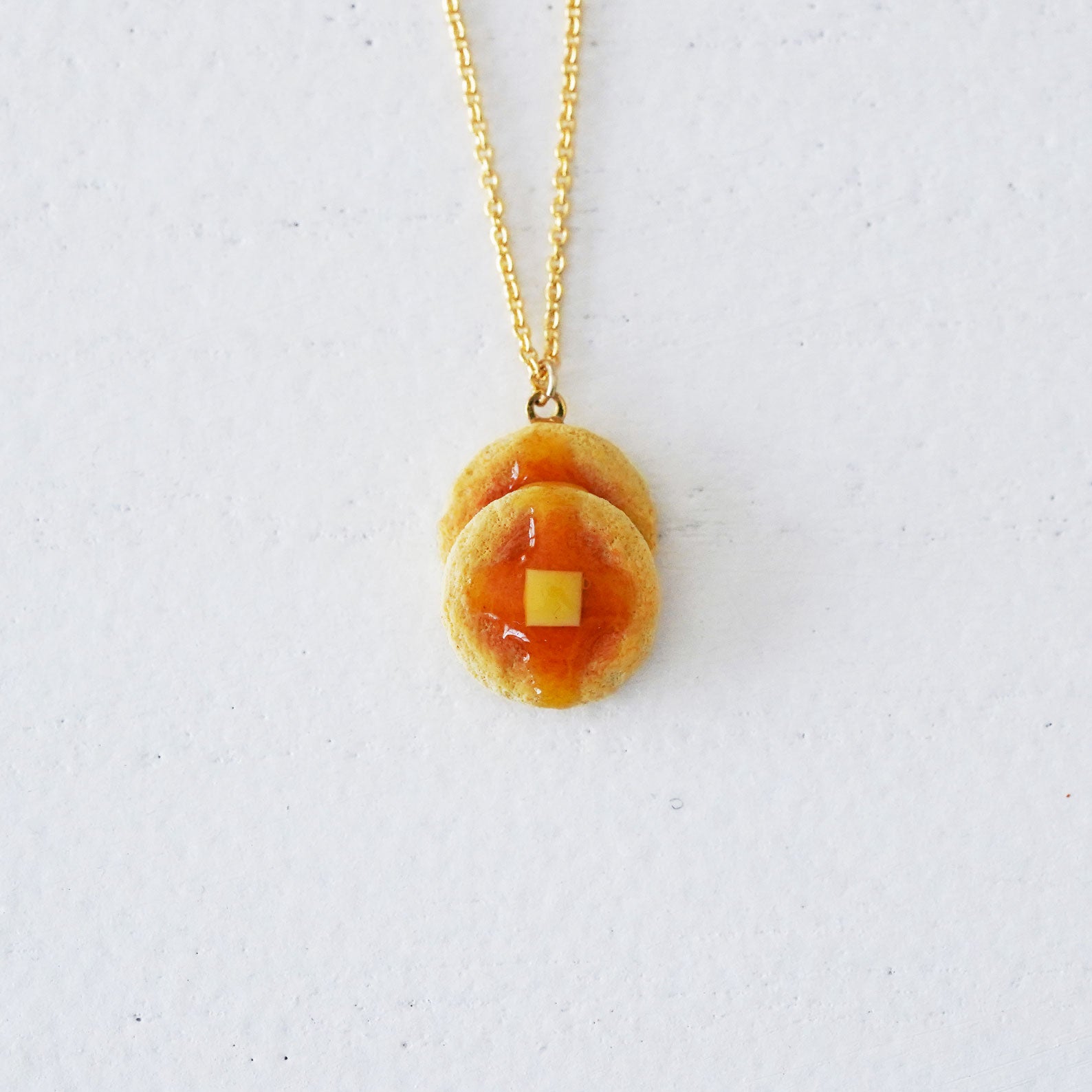 This handmade pancake necklace is crafted with clay and resin, creating a unique and durable accessory. Show off your love for breakfast with this charming necklace that adds a touch of whimsy to any outfit.