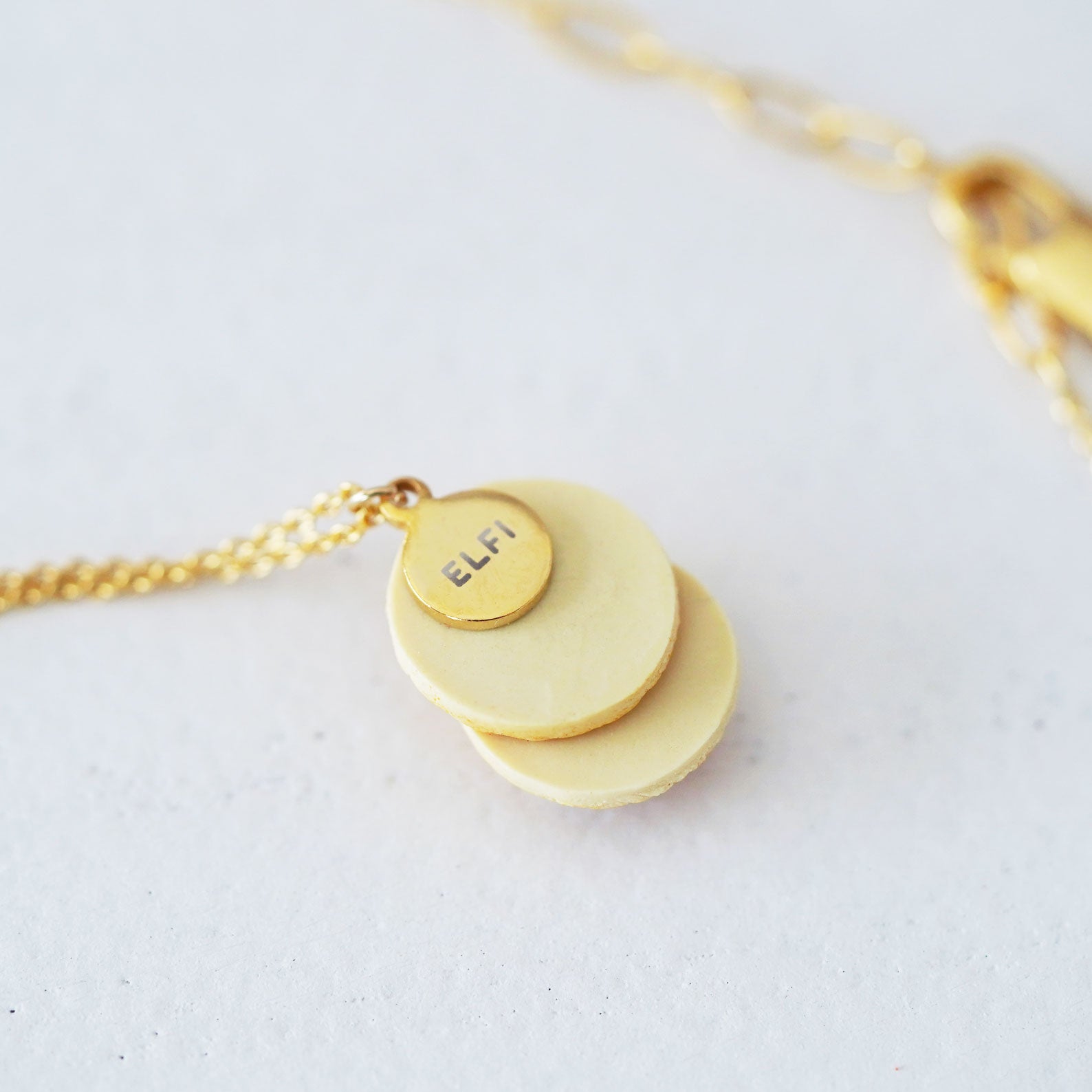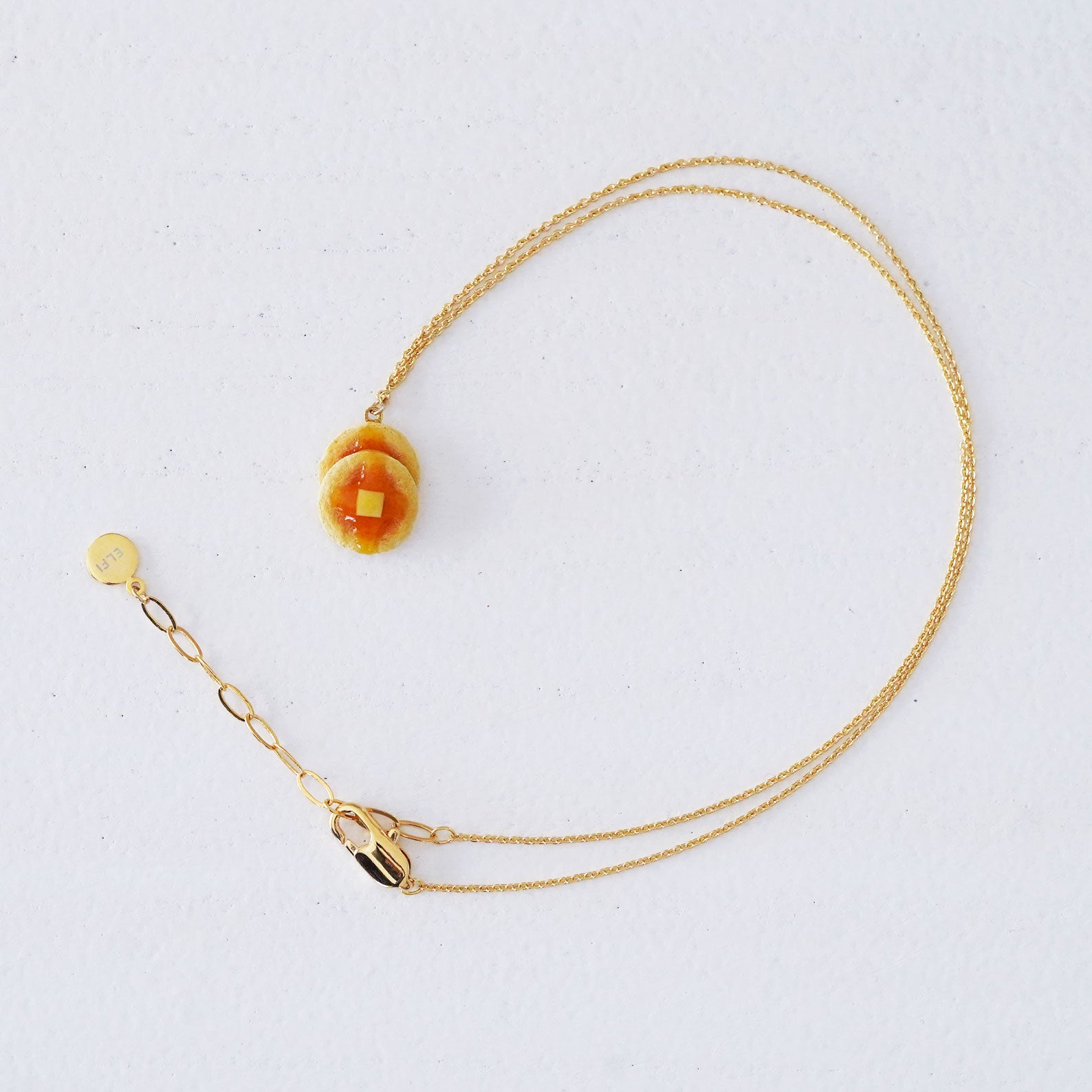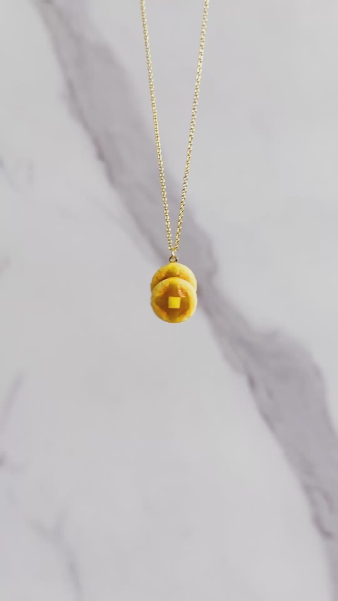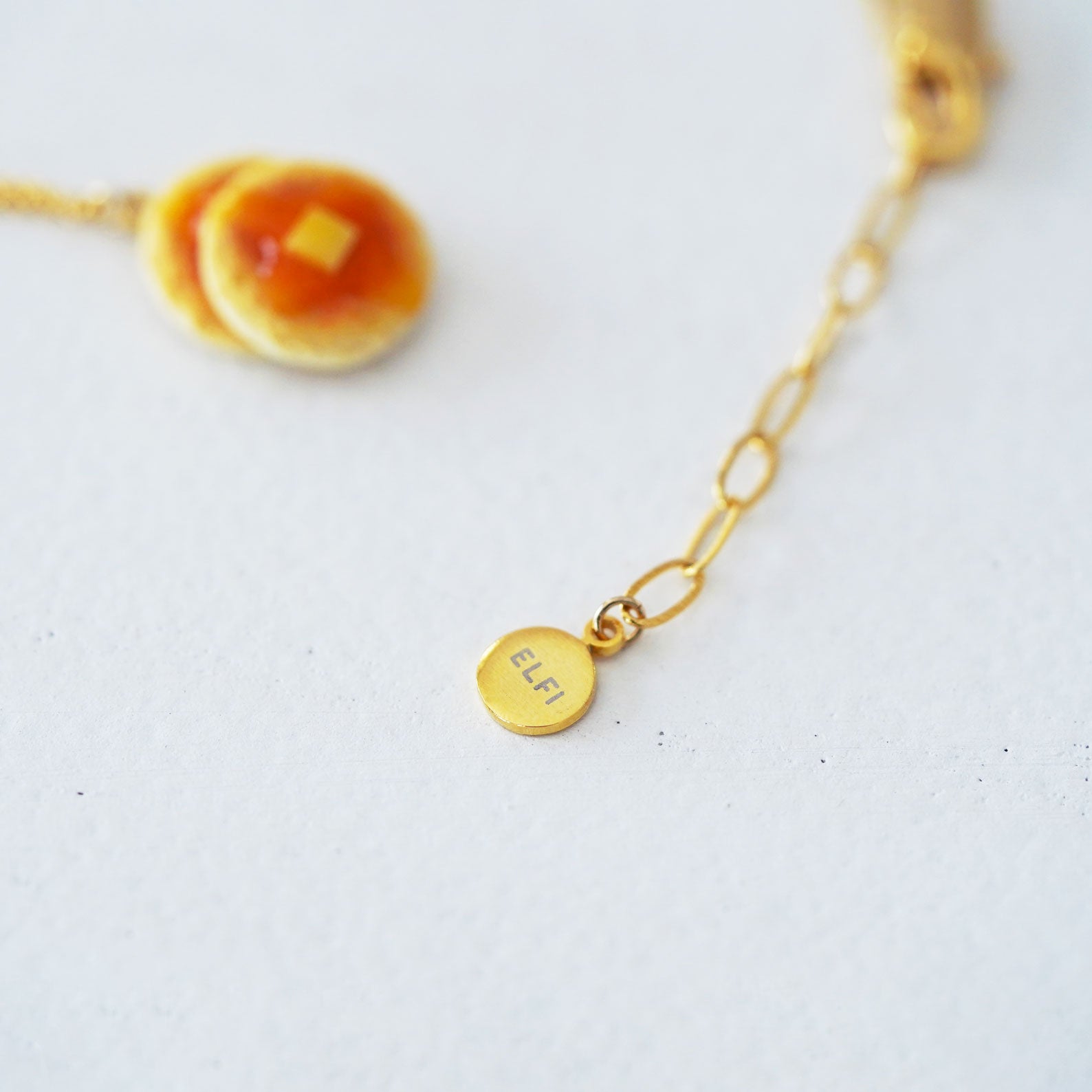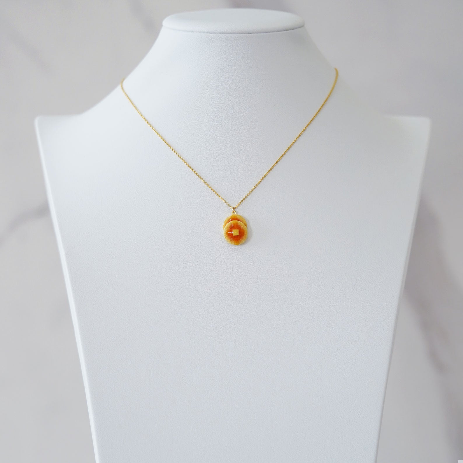 This handmade pancake necklace is crafted with clay and resin, creating a unique and durable accessory. Show off your love for breakfast with this charming necklace that adds a touch of whimsy to any outfit.
