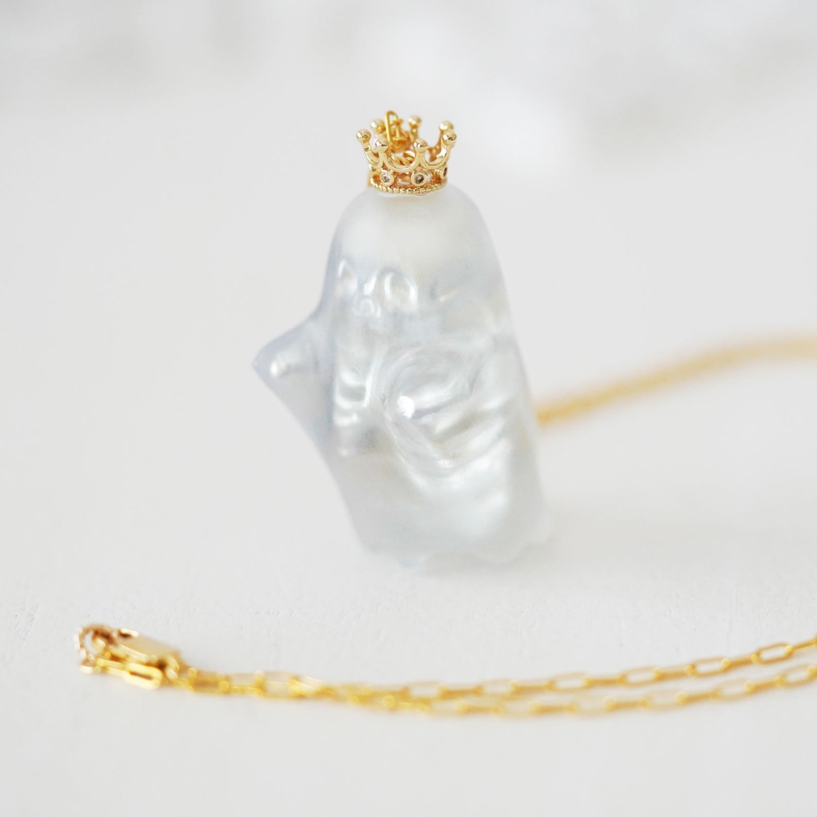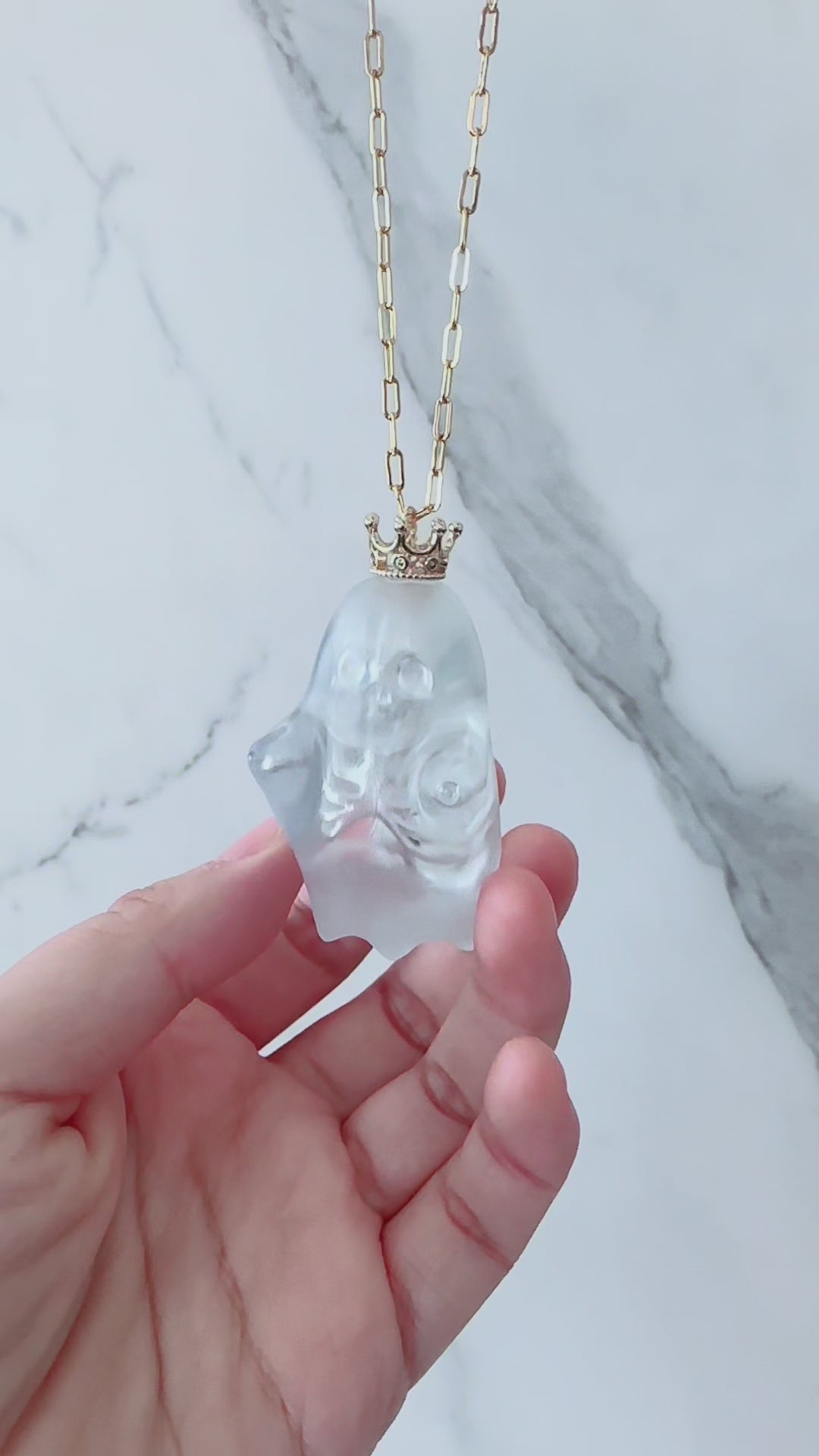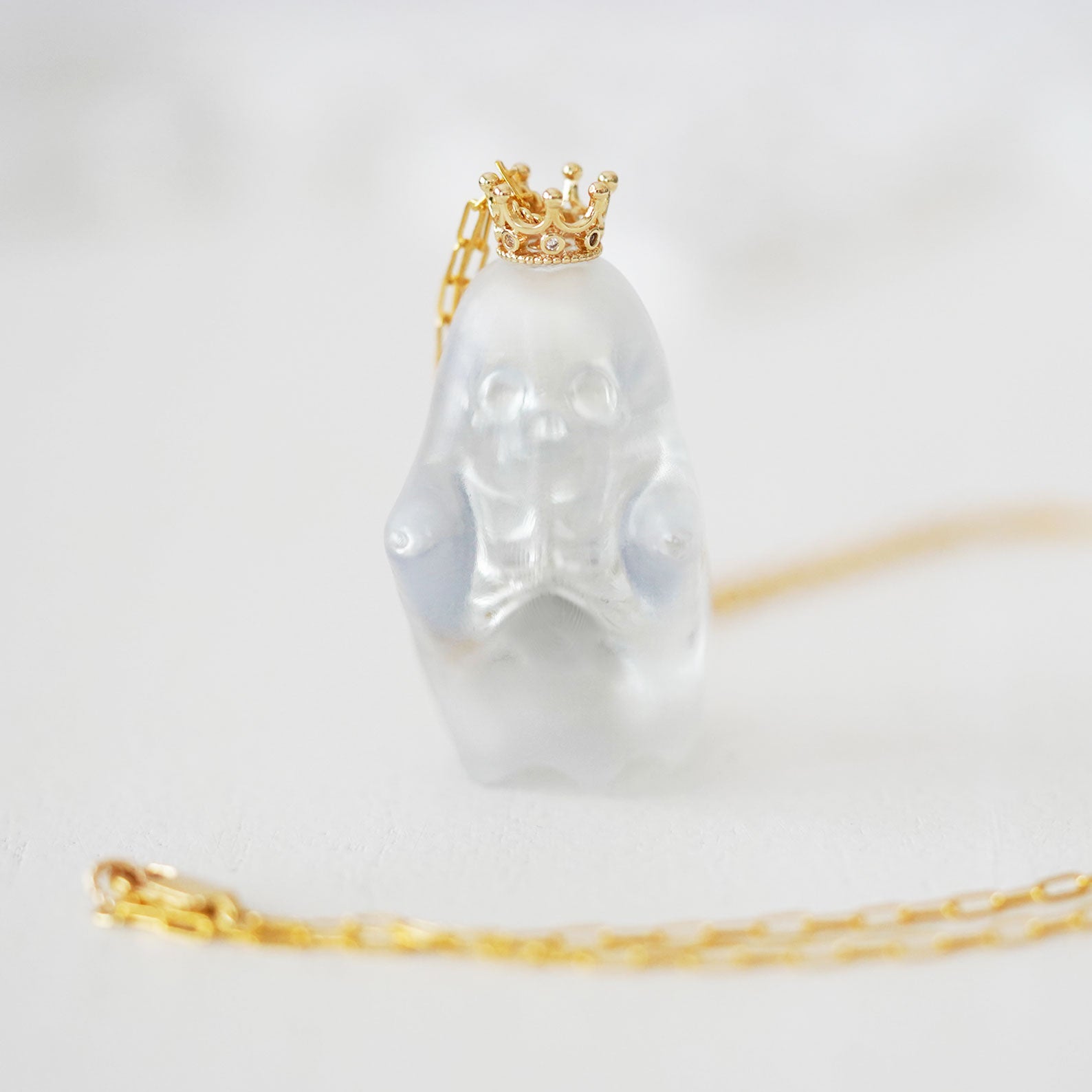 Each ghost pendant is handcrafted with love, featuring a semi-transparent matte finish that lets the delicate skeleton details show through. The gold crown adds a playful royal touch, making it both mysterious and adorable.