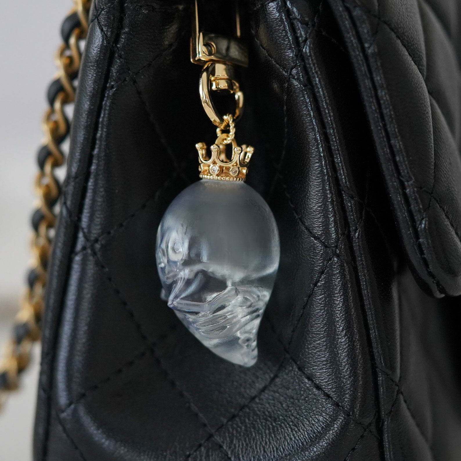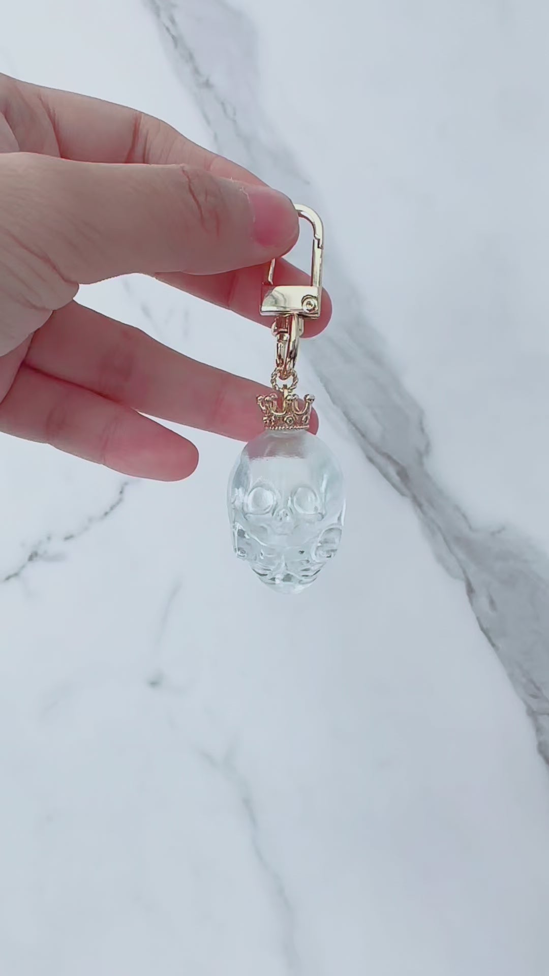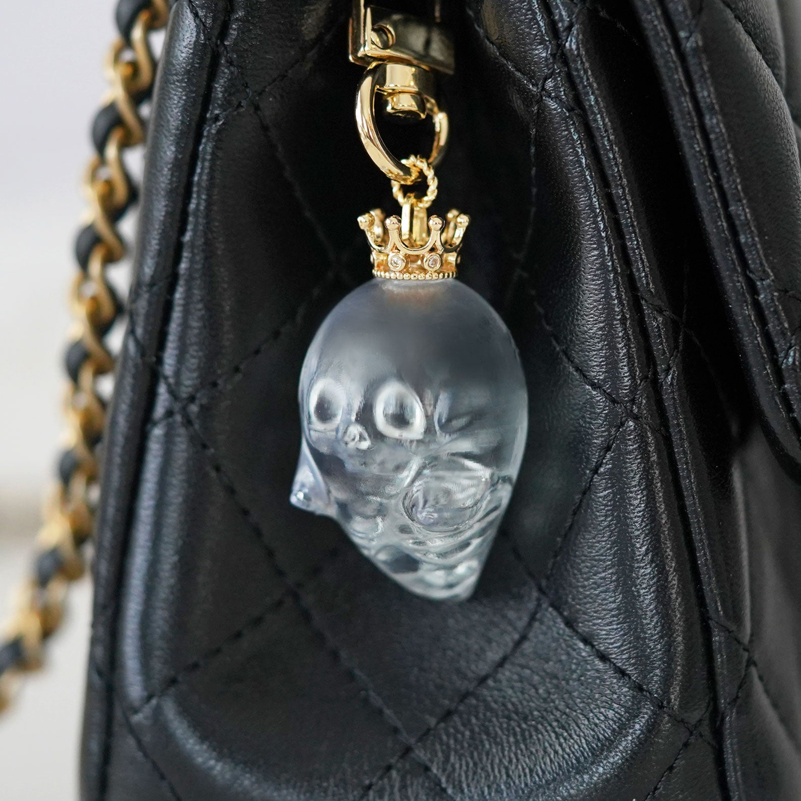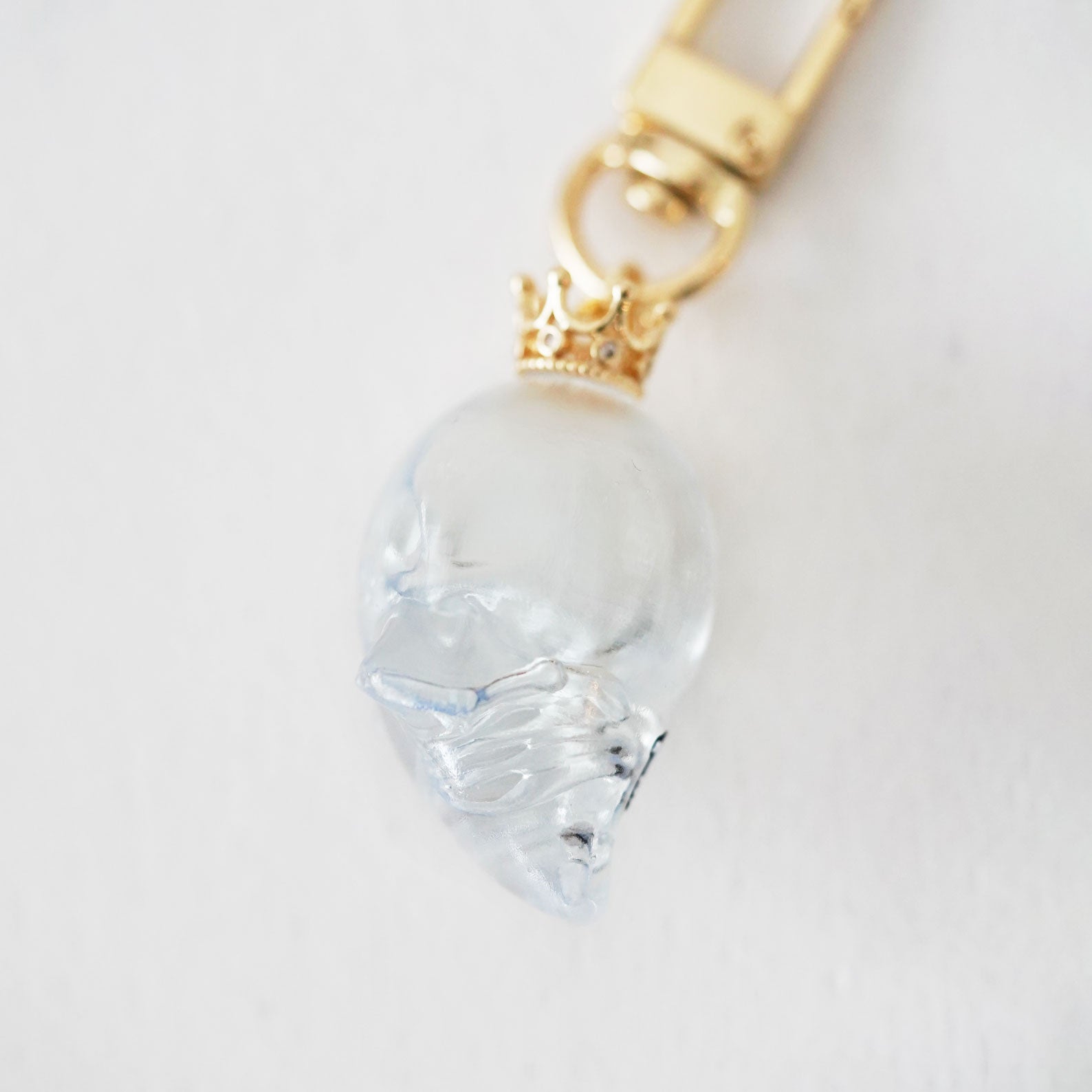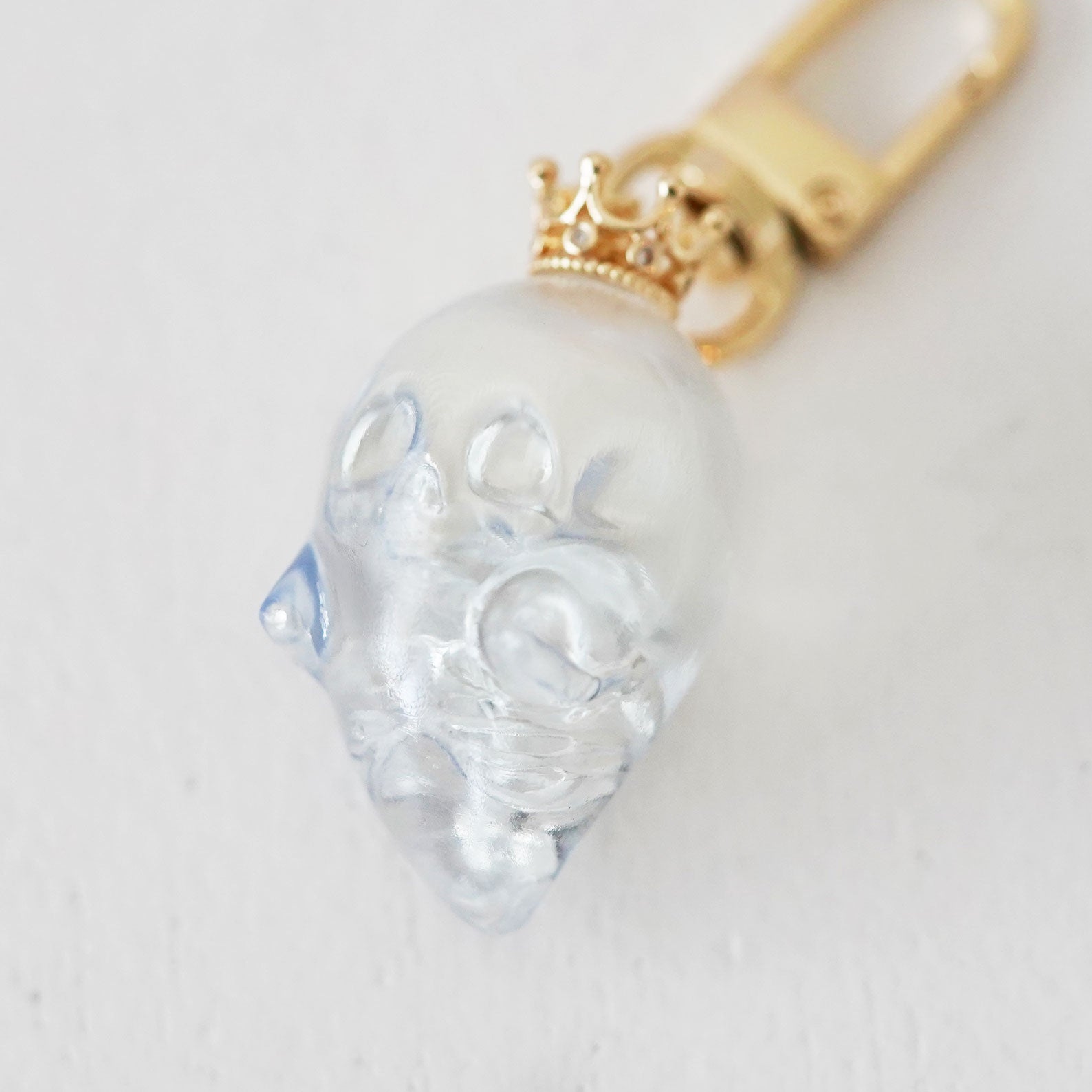 Regal and hauntingly adorable. This frosted resin ghost head bag charm features a tiny skull inside and is topped with a golden crown. It blends eerie elegance with kawaii style, making it a standout accessory for Halloween or everyday gothic looks.